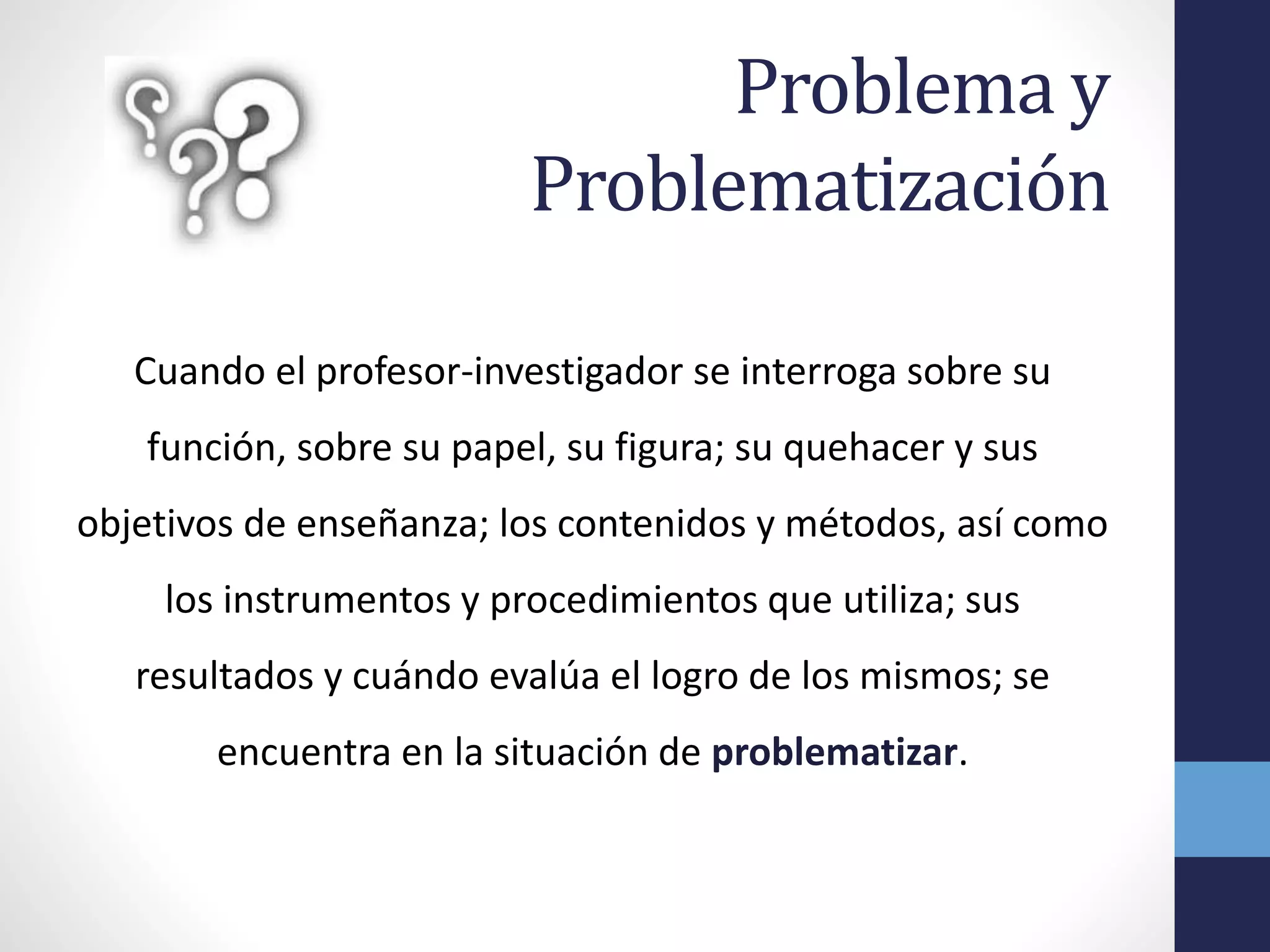 Este documento describe el proceso de problematización en la investigación científica. Explica que la problematización implica cuestionar los conceptos existentes para identificar y construir problemas de investigación. También describe las etapas de este proceso, incluyendo definir el contexto del problema, precisar su marco de referencia, y distinguir entre situaciones problemáticas y problemas de investigación específicos. Finalmente, enfatiza que saber problematizar es fundamental para los investigadores y para enseñar a otros a generar conocimiento científico.