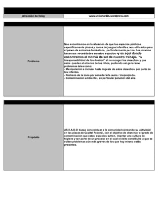 Este documento identifica el problema de los dueños de perros que no recogen los desechos de sus mascotas en las plazas y zonas de juegos, lo que puede causar que los niños manipulen o ingieran los desechos. También identifica el propósito de la campaña AS.E.A.D.O de concientizar a la comunidad sobre la importancia de recoger los desechos caninos para reducir la contaminación en las plazas y fomentar una cultura de higiene.