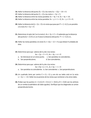 Este documento presenta una serie de problemas relacionados con rectas en el plano cartesiano. Incluye problemas para encontrar ecuaciones de rectas dados puntos o condiciones como pendiente, paralelismo o perpendicularidad. También incluye problemas para determinar distancias entre puntos y rectas, hallar mediatrices, y verificar propiedades geométricas como triángulos rectángulos y rombos.