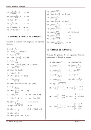 Este documento presenta problemas de cálculo diferencial e integral. En la primera sección, se pide encontrar el conjunto solución para 60 desigualdades. La segunda sección solicita determinar el dominio y la imagen para 21 funciones. Finalmente, la tercera sección pide graficar 10 funciones determinando su dominio e imagen.