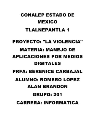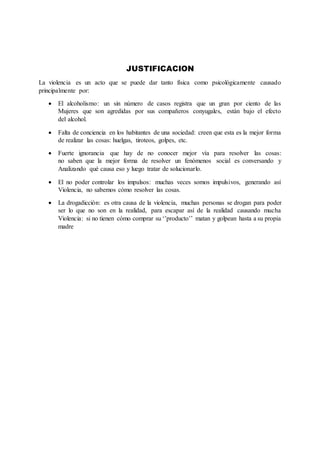 Este documento trata sobre la violencia. Explica las causas principales de la violencia como el alcoholismo, la falta de conciencia social, la ignorancia y la incapacidad de controlar los impulsos. El objetivo es crear conciencia sobre la violencia intrafamiliar y cómo esto afecta a la sociedad. La hipótesis es que la violencia en la familia es la base de la violencia generalizada y que causa daños físicos y psicológicos. Finalmente, la conclusión es que la violencia es un tema delicado que requiere tratamiento a fondo para
