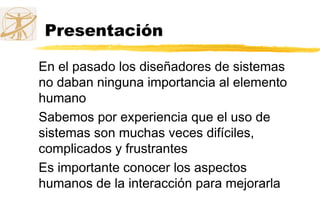 Este documento introduce el concepto de factor humano en la interacción persona-ordenador. Explica que los diseñadores de sistemas anteriormente no consideraban el elemento humano, lo que llevaba a interfaces difíciles y frustrantes. A continuación, resume los objetivos, contenidos y modelos de procesamiento de información humana, incluyendo la percepción, memoria y cognición.