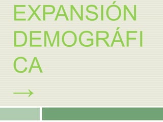 El documento habla sobre la expansión demográfica. Explica que es el rápido aumento en el número de seres humanos debido a mejoras agrícolas y médicas que reducen la mortalidad infantil y aumentan la esperanza de vida. Este crecimiento poblacional puede afectar negativamente el medio ambiente al aumentar el uso de recursos y la destrucción de hábitats, así como incrementar la contaminación y problemas de salud pública.