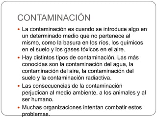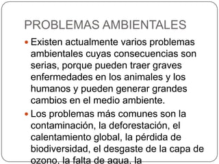El documento describe varios problemas ambientales graves como la contaminación, deforestación, calentamiento global, pérdida de biodiversidad y falta de agua. Explica cada problema en detalle, incluyendo sus causas y consecuencias. También señala que estos problemas están interrelacionados y se afectan unos a otros.