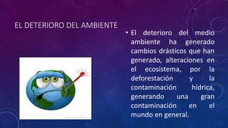 Este documento describe los problemas ambientales en Puerto López, Colombia, incluyendo la deforestación, contaminación de fuentes hidrográficas debido a la mala gestión de basuras y aguas residuales, y el agua potable no segura debido a la falta de tratamiento. También habla sobre la diversidad de fauna y flora locales, y los efectos del cambio climático como el efecto invernadero y el calentamiento global.