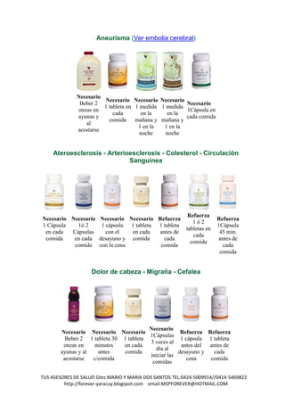 El documento es un vademécum de remedios naturales del Dr. Enrique Garza, actualizado por el Lic. Vené Angel Rodríguez, que detalla recomendaciones nutricionales y suplementos de Forever Living Products para diversas afecciones cardiovasculares y otros problemas de salud. Se enfatiza la importancia de no suspender el tratamiento médico y de consultar a un profesional de salud. Cada afección incluye dosis específicas y modos de administración de productos complementarios.