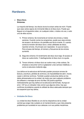 El documento proporciona información sobre los posibles síntomas y causas de problemas comunes en hardware y software de computadoras. Entre los problemas discutidos se incluyen fallas en discos duros (aumento de errores, rendimiento lento, ruido), placas base (quemado de microprocesador), monitores (fallas en transformadores o tubo de imagen) y problemas de software (errores de programación, instalación/desinstalación de programas, apagado incorrecto del sistema). También se mencionan posibles problemas con sistemas operativos