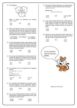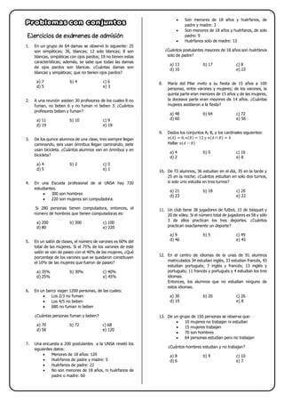 El documento contiene 23 ejercicios de matemáticas y lógica de exámenes de admisión. Los ejercicios involucran conceptos como conjuntos, probabilidad, estadística y razonamiento lógico. Cada ejercicio presenta un problema con datos numéricos y opciones de respuesta múltiple para seleccionar la respuesta correcta.