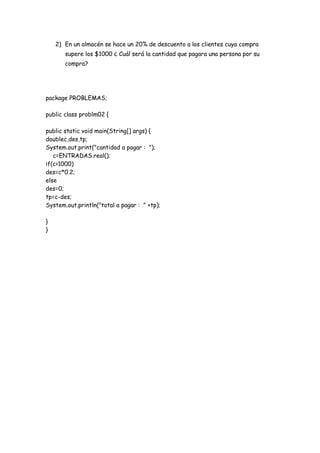 El documento presenta 12 problemas condicionales que involucran el uso de estructuras condicionales if-else para resolver problemas como determinar si un alumno aprueba o reprueba un curso basado en su promedio, calcular descuentos en compras que superen ciertos montos, calcular salarios semanales de obreros con horas extras, calcular áreas de círculos, ordenar números de mayor a menor, y otros problemas similares.