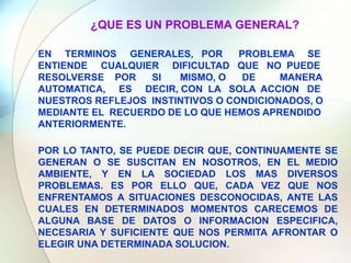 Este documento describe los diferentes tipos de problemas que enfrentan los seres humanos en su vida diaria, incluyendo problemas de razonamiento, dificultades y conflictos. Explica que los problemas surgen cuando no se cuenta con la información necesaria para resolver una situación de manera automática. Además, sugiere que la educación escolar puede ayudar a mejorar la conducta humana y preparar a las personas para hacer frente a diferentes situaciones problémicas.