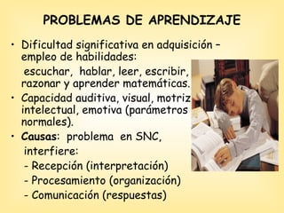 El documento describe varios problemas de aprendizaje como la dislalia, disgrafía, dislexia, discalculia y disortografía. Estos problemas se caracterizan por dificultades significativas en habilidades como escuchar, hablar, leer, escribir, razonar y aprender matemáticas. El documento también proporciona ejemplos de causas, características y estrategias de corrección para cada problema de aprendizaje.