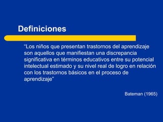 El documento define a los niños con dificultades en el aprendizaje como aquellos que muestran una discrepancia entre su potencial intelectual y su rendimiento académico, debido a problemas en uno o más procesos psicológicos básicos como la comprensión del lenguaje, la lectura o las matemáticas. Las causas pueden ser traumas, factores genéticos o bioquímicos. Los trastornos de aprendizaje se evalúan con pruebas de inteligencia, lenguaje y rendimiento académico