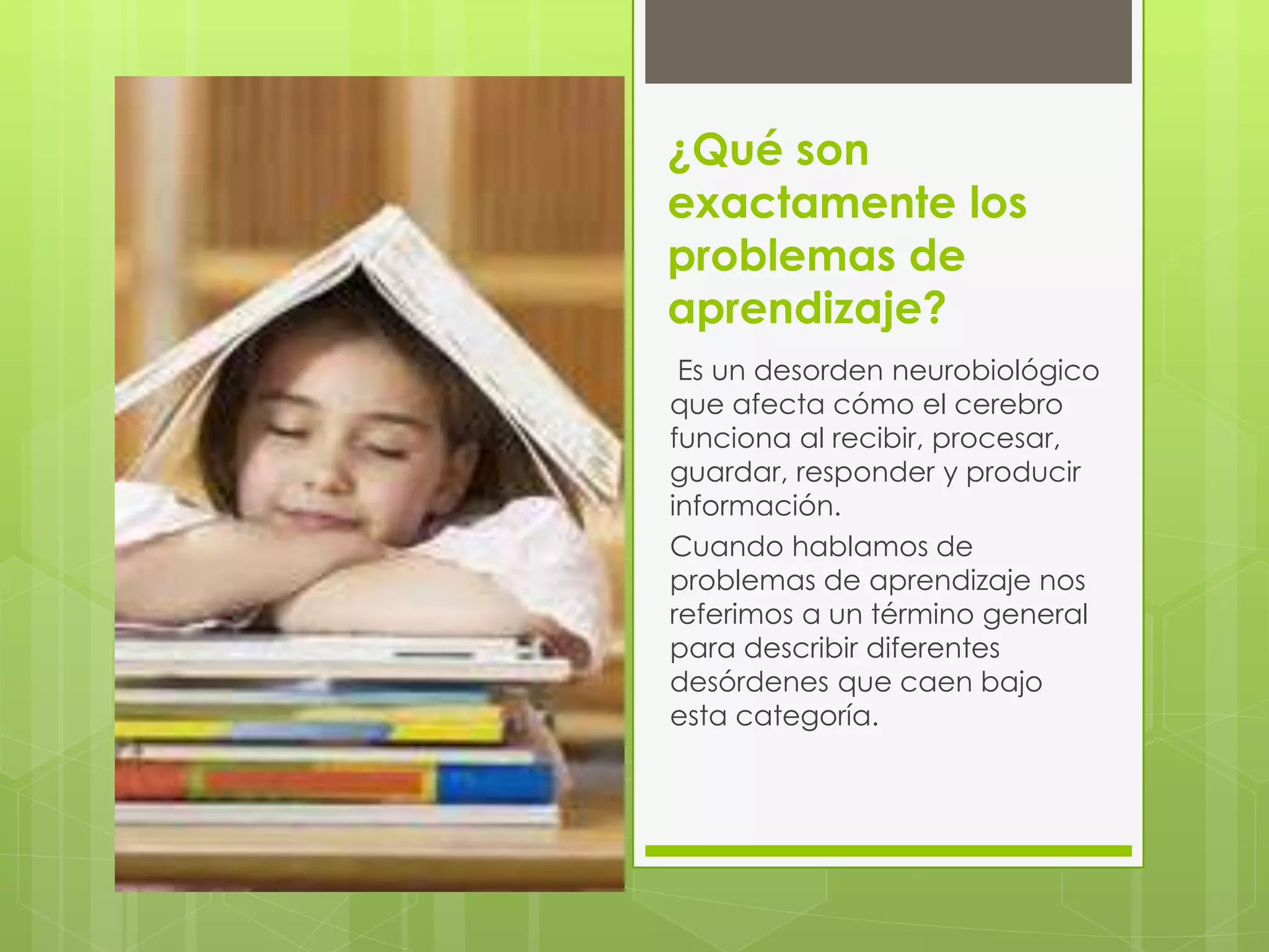 Este documento describe los problemas de aprendizaje. Se define como un desorden neurobiológico que afecta cómo el cerebro procesa la información. Aunque las causas exactas son desconocidas, se cree que son el resultado de cómo la persona procesa la información en su mente a través de cuatro etapas: entrada, integración, memoria y salida de información. El documento también proporciona consejos para padres, maestros y formas de apoyar a los niños con problemas de aprendizaje.