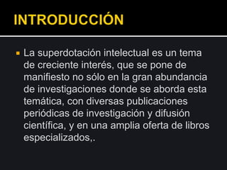 Los programas de intervención para alumnos superdotados se centran en el niño pero también incluyen a la familia. La mayoría tienen un enfoque académico aunque los aspectos socioemocionales también son importantes. Algunos programas se enfocan en la formación de los padres para apoyar el desarrollo integral del niño superdotado. Existe controversia en temas como la definición y detección de la superdotación y el peso de factores genéticos versus ambientales.