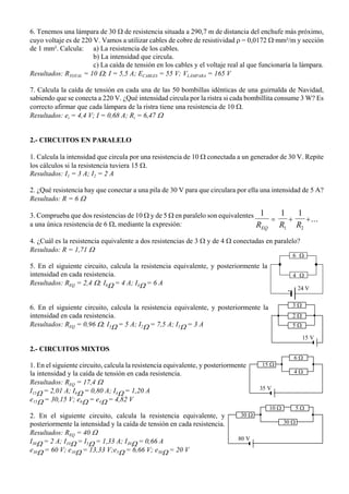 1. El documento presenta conceptos básicos sobre circuitos eléctricos en serie, paralelo y mixtos, incluyendo cálculos de intensidad, voltaje, resistencia equivalente y potencia. También cubre circuitos de Kirchhoff y corriente alterna.