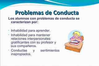 El documento describe varios problemas de conducta que pueden presentar los estudiantes, como dificultad para aprender, mantener relaciones interpersonales y controlar sus emociones e impulsos. También habla sobre trastornos como TDAH y estrategias de modificación de conducta como reforzamiento positivo, economía de fichas y círculo mágico.