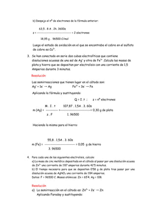 El documento trata sobre problemas de electrolisis y proporciona resoluciones a varios ejercicios numéricos relacionados con el cálculo de masas de sustancias depositadas en el cátodo o ánodo durante procesos de electrolisis. Se explican conceptos como la ley de Faraday, las semirreacciones catódicas y anódicas, y cómo aplicar las fórmulas apropiadas para realizar los cálculos requeridos en cada caso.