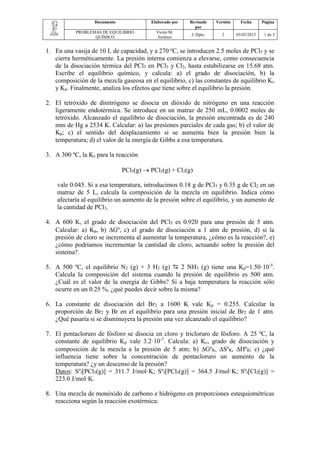Este documento presenta 22 problemas relacionados con equilibrios químicos, incluyendo cálculos de constantes de equilibrio, composiciones de mezclas gaseosas, y efectos de cambios en presión, temperatura y concentraciones sobre el equilibrio. Los problemas cubren temas como disociación térmica, equilibrios homogéneos y heterogéneos, y cálculos termodinámicos.
