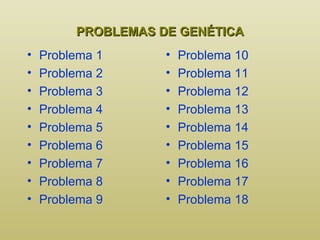 PROBLEMAS DE GENÉTICAProblema 1 Problema 2 Problema 3 Problema 4 Problema 5 Problema 6 Problema 7 Problema 8 Problema 9 Problema 10 Problema 11 Problema 12 Problema 13 Problema 14 Problema 15 Problema 16 Problema 17 Problema 18