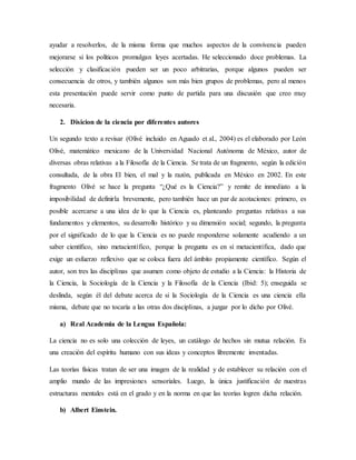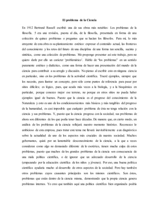 El documento presenta una discusión sobre los problemas de la ciencia actual. En primer lugar, identifica doce problemas principales de la ciencia relacionados tanto con factores internos de la propia ciencia como con la política científica. Segundo, reconoce que el análisis de estos problemas proporciona información sobre el momento histórico actual. Tercero, sostiene que una mejor política científica podría ayudar a resolver algunos de estos problemas y contribuir al desarrollo de la sociedad.