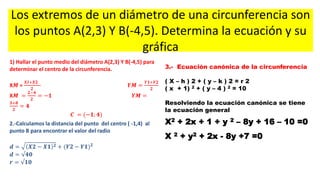 2. Se explican los pasos para resolver cada problema, como encontrar el centro como punto medio de diámetros, usar la distancia entre puntos para hallar el radio, y sustituir valores en la fórmula canónica.