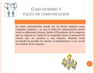 Este documento presenta cuatro casos de problemas de comunicación en una empresa y analiza cada uno brevemente. El segundo caso se refiere a la falta de comunicación entre los trabajadores y sus superiores, lo que resulta en que las sugerencias de los trabajadores no sean escuchadas y puedan surgir dificultades. El problema principal identificado es la falta de liderazgo efectivo en la empresa.