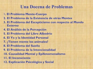 Este documento presenta una docena de problemas fundamentales de la filosofía de la mente, incluyendo el problema mente-cuerpo, la existencia de otras mentes, el escepticismo sobre el mundo externo, el análisis de la percepción, el libre albedrío, la identidad personal, la intencionalidad de los estados mentales, la causalidad mental y el epifenomenalismo.