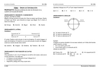 Este documento presenta diferentes tipos de problemas de ordenamiento de información, incluyendo ordenamiento creciente/decreciente, lateral, por posición de datos, circular y de doble entrada. Proporciona ejemplos para cada tipo y una serie de 15 problemas adicionales para la práctica del estudiante con la ayuda del docente.