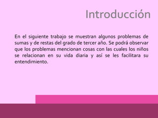 El documento presenta algunos problemas matemáticos de sumas y restas para tercer grado que involucran situaciones cotidianas como manzanas, muñecas, cerezas y botones para facilitar la comprensión de los niños. Explica que los problemas se resuelven con sumas o restas sencillas y concluye que al usar temas familiares y un lenguaje simple se ayuda a los niños a entender mejor los problemas.