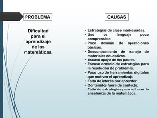 El documento describe los problemas de aprendizaje en el aula, incluyendo la dificultad para aprender matemáticas. Las causas de esta dificultad incluyen estrategias de enseñanza inadecuadas por parte de los docentes, falta de dominio de conceptos básicos y resolución de problemas por parte de los estudiantes, y escaso apoyo de los padres.