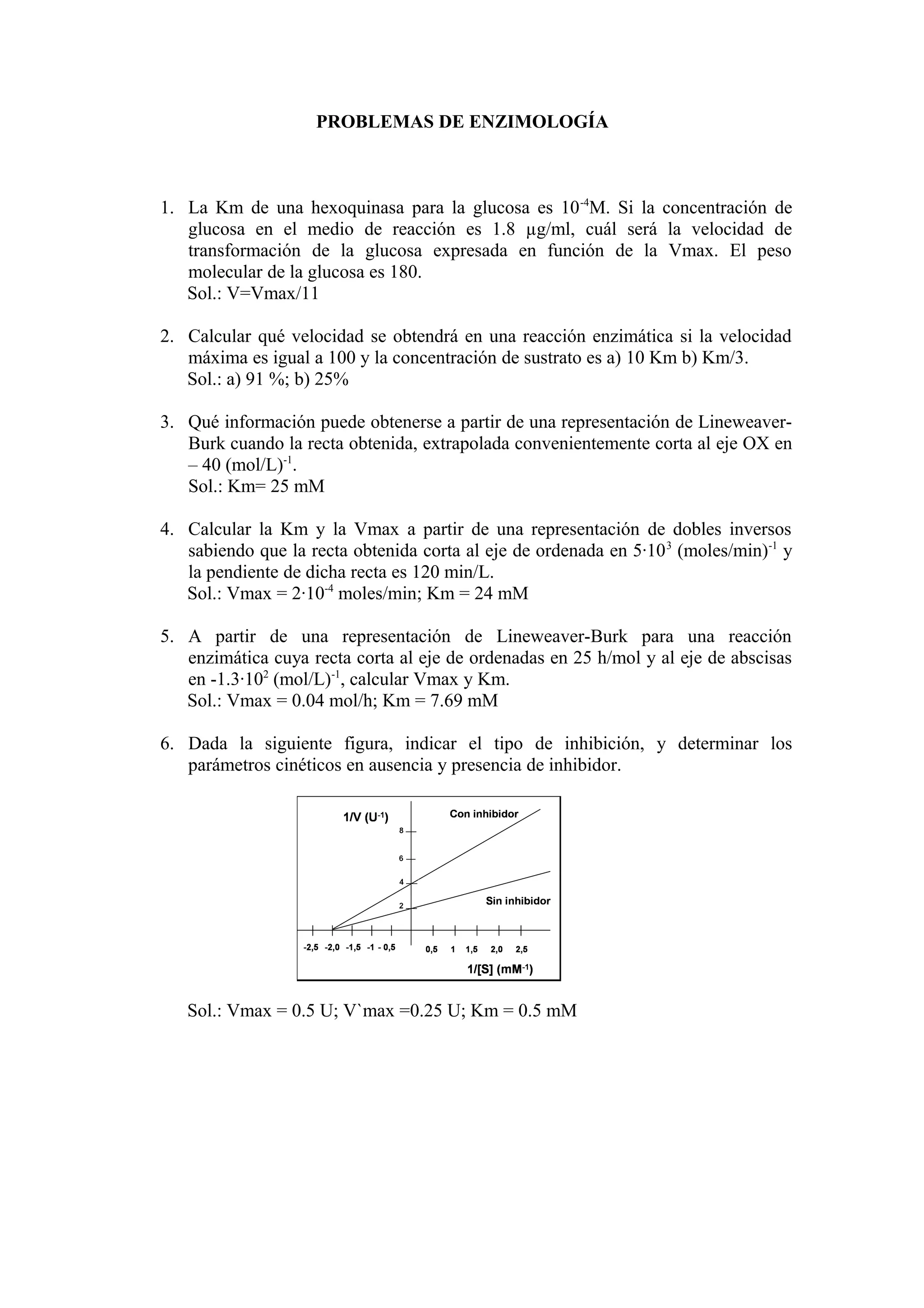 Este documento presenta 7 problemas de enzimología con sus soluciones. Los problemas cubren temas como el cálculo de la velocidad de reacción en función de la concentración de sustrato y la Vmax, el análisis de gráficas de Lineweaver-Burk para determinar parámetros cinéticos como la Km y la Vmax, y la identificación del tipo de inhibición y cálculo de parámetros de inhibición a partir de datos experimentales sobre velocidad de reacción con y sin inhibidores.