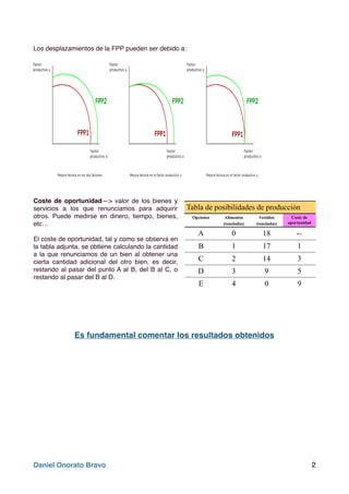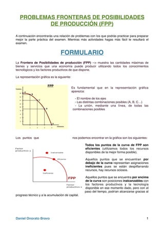 Este documento presenta varios ejemplos y problemas relacionados con la Frontera de Posibilidades de Producción (FPP). Explica que la FPP muestra las cantidades máximas que una economía puede producir usando todos sus recursos de manera eficiente. Incluye ejemplos de cómo representar gráficamente la FPP y calcular el costo de oportunidad de cambiar la producción entre bienes. También cubre cómo cambios en los factores productivos afectan la posición de la FPP. El documento proporciona soluciones detalladas a cinco problemas