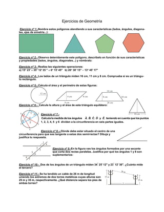 Este documento contiene 51 ejercicios de geometría que abarcan conceptos como polígonos regulares e irregulares, triángulos, círculos, ángulos, perímetros, áreas y más. Los ejercicios deben resolverse calculando medidas, comprobando propiedades geométricas, y justificando resultados.