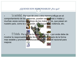 Este documento resume cinco problemas internos en Perú: la violencia, el pandillaje juvenil, el terrorismo, la corrupción y la pobreza. Explica brevemente cada problema y propone soluciones como la educación, el control de fondos de grupos terroristas, mayor transparencia y control fiscal para combatir la corrupción, y apoyar grupos que ayudan a los pobres.