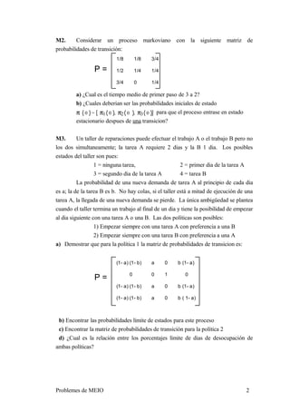 Este documento presenta 10 problemas relacionados con cadenas de Markov. Los problemas cubren temas como matrices de probabilidad de transición, tiempos de primer paso, estados estacionarios, clases de Markov, y aplicaciones a sistemas de inventario y embalses.