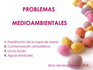 Los principales problemas medioambientales descritos son: 1) Debilitación de la capa de ozono debido a gases como los CFC, 2) Contaminación atmosférica causada por emisiones de combustibles fósiles, 3) Lluvia ácida formada por dióxido de azufre y óxidos de nitrógeno, y 4) Necesidad de tratar adecuadamente las aguas residuales antes de devolverlas a ríos y mares.