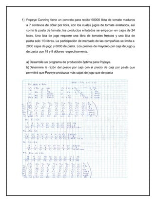 Este documento presenta tres problemas de optimización de producción. El primero involucra a Popeye Canning que debe decidir la cantidad óptima de jugo de tomate y pasta de tomate para producir dado ciertos insumos y límites de mercado. El segundo trata sobre Electra que produce dos tipos de motores eléctricos y debe asignar la producción dada la capacidad de las líneas y el suministro limitado de un componente. El tercero se refiere a BABA Furture Company que debe optimizar la producción de mesas y sillas dado