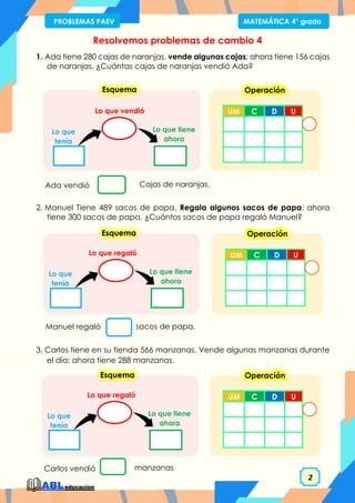 El documento presenta una serie de problemas matemáticos de cambio y comparación para cuarto grado. Los problemas involucran cantidades iniciales y finales de diferentes objetos (naranjas, sacos de papa, semillas, etc.) y piden calcular la cantidad cambiada, así como problemas que comparan cantidades entre personas e involucran restar la diferencia para encontrar la cantidad desconocida.