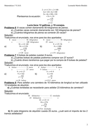 Este documento presenta la solución a 16 problemas de matemáticas relacionados con porcentajes, descuentos, conversión de unidades y cálculos financieros. Los problemas van desde calcular la edad de una persona basada en la edad de su madre hasta determinar cuánto dinero pagará una familia por el consumo anual de agua.