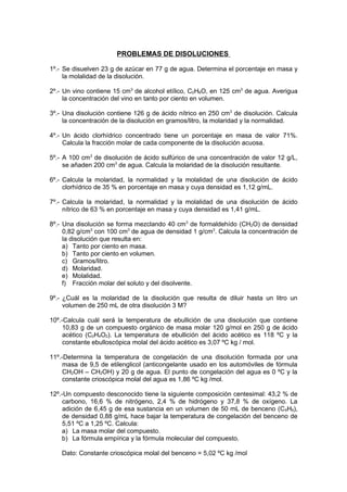 Este documento presenta una serie de problemas relacionados con conceptos de química como átomos, moléculas, moles, gases ideales, disoluciones, reacciones químicas, termoquímica y cinemática. Los problemas cubren temas como cálculos de masa, número de moles, volumen y concentración de sustancias químicas, así como reacciones, energía y movimiento.