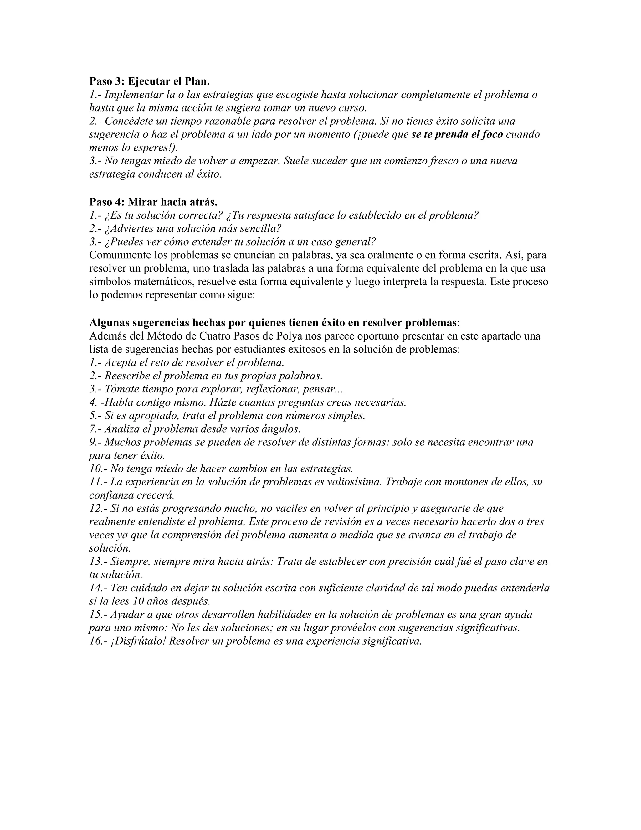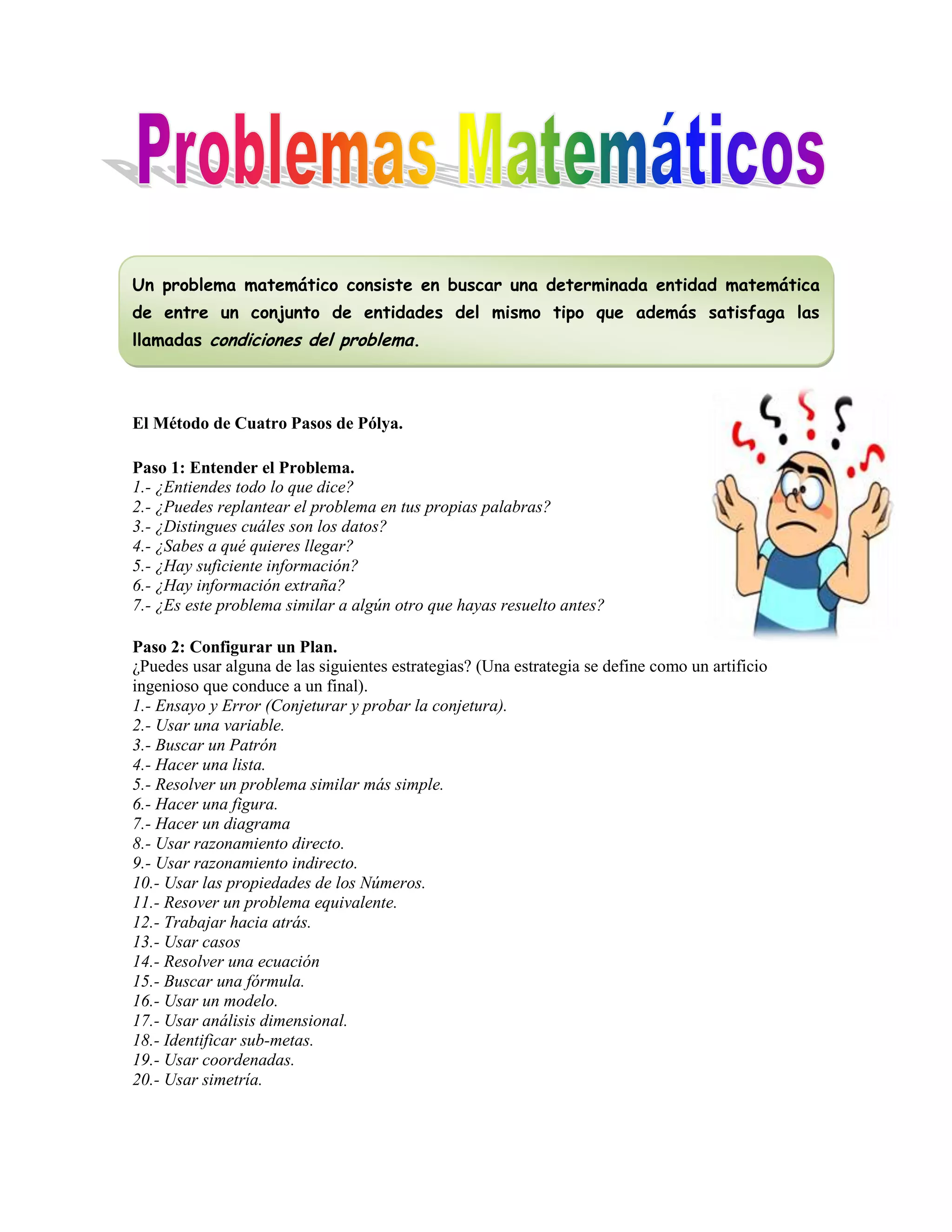 Un problema matemático consiste en encontrar una entidad matemática que satisfaga ciertas condiciones. El Método de Cuatro Pasos de Pólya para resolver problemas incluye entender el problema, configurar un plan, ejecutar el plan y mirar hacia atrás. Adicionalmente, se sugiere aceptar el reto, explorar el problema desde varios ángulos, y revisar la solución para asegurar la comprensión.