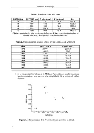 Este documento presenta dos problemas de hidrología. El primer problema analiza las precipitaciones en una cuenca con cinco estaciones, calculando la precipitación media a través de diferentes métodos y contrastando los datos entre estaciones. El segundo problema trata de calcular las precipitaciones máximas diarias para períodos de retorno de 10 y 50 años a partir de datos históricos de una estación.