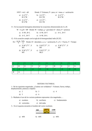 Este documento presenta varios problemas relacionados con el análisis dimensional y el movimiento rectilíneo uniforme y uniformemente variado. Incluye preguntas sobre las ecuaciones dimensionales de magnitudes físicas como presión, temperatura y trabajo, así como cálculos de vectores resultantes, velocidades y tiempos en diferentes situaciones de movimiento.