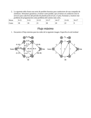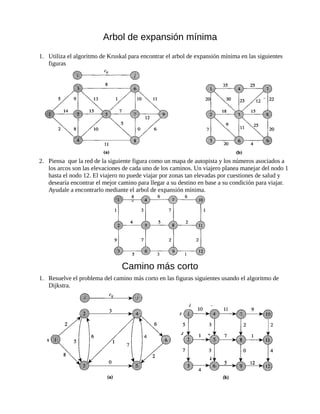 Este documento presenta tres algoritmos de optimización en grafos: el algoritmo de Kruskal para encontrar el árbol de expansión mínima, el algoritmo de Dijkstra para encontrar el camino más corto y el algoritmo de flujo máximo para encontrar el flujo máximo en una red. Instruye al lector en cómo aplicar estos algoritmos para resolver problemas de ruta óptima, programación y flujo en redes.