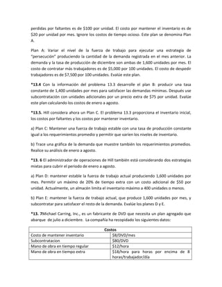 El documento presenta varios problemas y ejercicios relacionados con la planificación de la producción y la demanda. El problema 13.1 muestra los pronósticos y demanda mensuales para una empresa de aire acondicionado durante un año. Los problemas subsiguientes presentan diferentes escenarios y planes para satisfacer la demanda, incluyendo mantener una fuerza de trabajo constante, variar la producción, permitir tiempo extra o subcontratación.