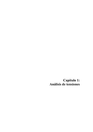 Este documento presenta varios problemas relacionados con el análisis de tensiones en estructuras. El primer problema analiza el tensor de tensiones dado y determina los planos y valores de las tensiones principales. Los problemas siguientes resuelven casos de tensión plana, hallando tensiones en planos inclinados, direcciones y valores de tensiones principales, y valores del tensor de tensiones original.
