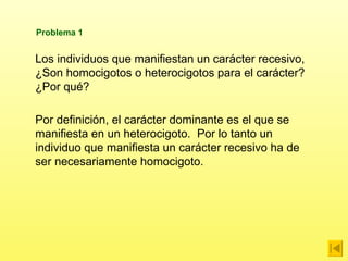 El documento trata sobre problemas de genética. Explica que los individuos que manifiestan un carácter recesivo son homocigotos para ese carácter. También analiza casos de herencia de caracteres como la acondroplasia y el color de la lana en borregos, determinando los genotipos de los progenitores. Finalmente, prevé las proporciones fenotípicas esperadas en la descendencia de cruces entre diferentes líneas de gallinas.