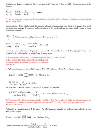 Este documento presenta la resolución de 12 ejercicios relacionados con las leyes de los gases. Los ejercicios aplican las leyes de Boyle, Charles, Gay-Lussac y la ecuación de los gases ideales para calcular volúmenes, presiones, moles y otras propiedades de gases en diferentes condiciones. Se proporcionan los pasos de cálculo para cada ejercicio utilizando las fórmulas y constantes apropiadas como la constante de los gases ideales R.