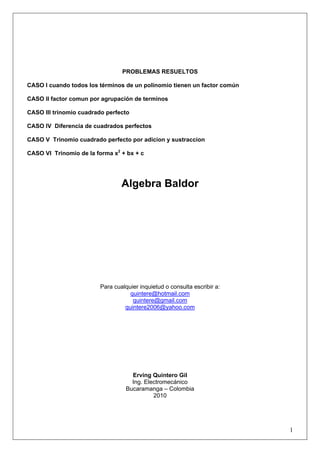 El documento presenta varios problemas resueltos sobre factorización de polinomios cuando todos los términos tienen un factor común. Se explica cómo identificar el factor común y escribir el polinomio factorizado colocando el factor común como coeficiente de un paréntesis dentro del cual se escriben los cocientes de dividir cada término entre el factor común. Se resuelven 21 problemas como ejemplos de esta técnica de factorización.