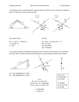 1) El documento presenta 5 problemas de física relacionados con la segunda ley de Newton y el equilibrio de fuerzas sobre planos inclinados. Los problemas resuelven casos que involucran fuerzas de fricción, aceleración, peso y equilibrio de sistemas de masas conectadas.